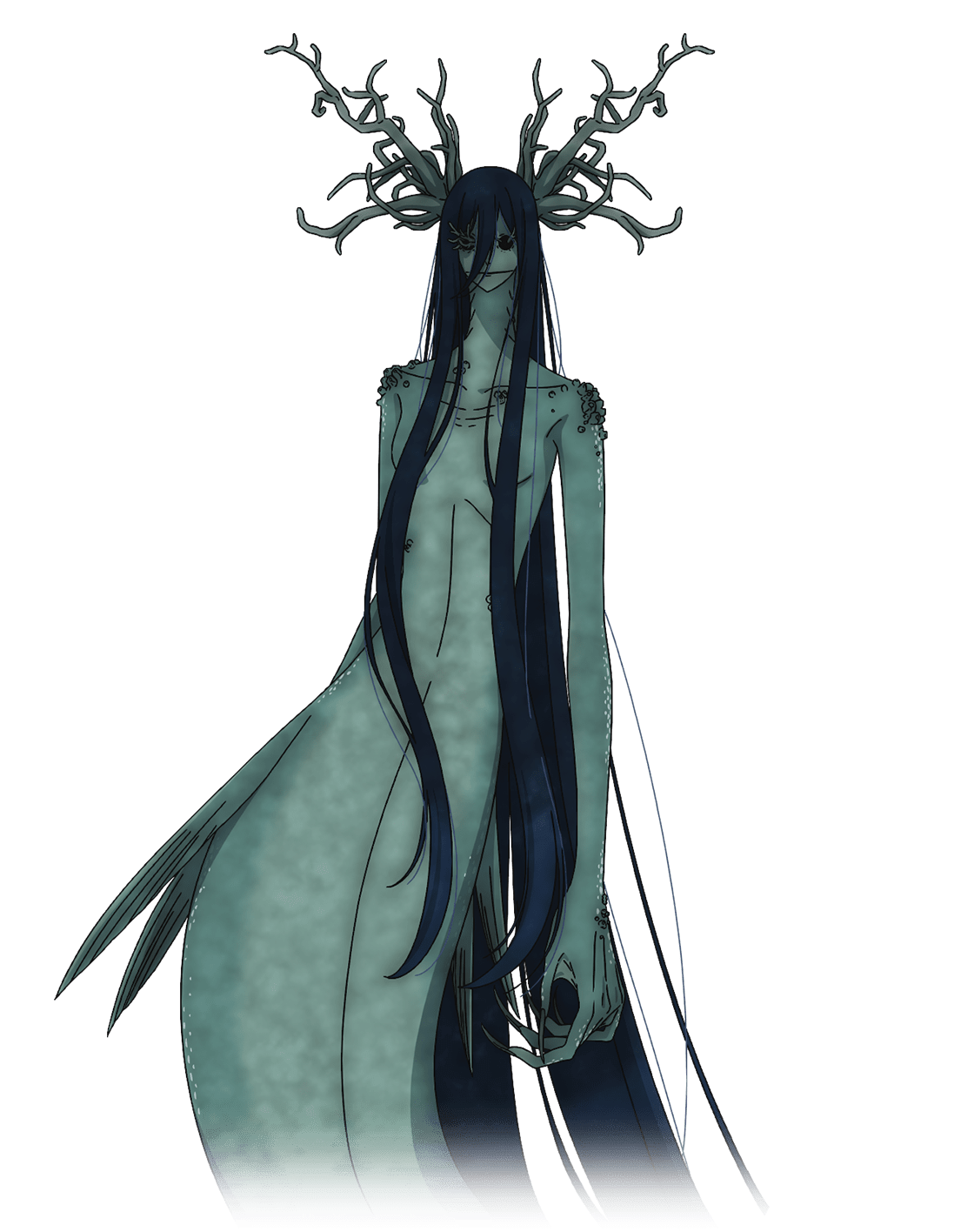 全身を鱗で覆われ、頭部からは珊瑚が生え、鋭く長い爪を持つ人魚の妖怪
