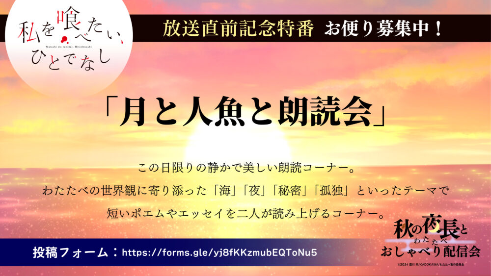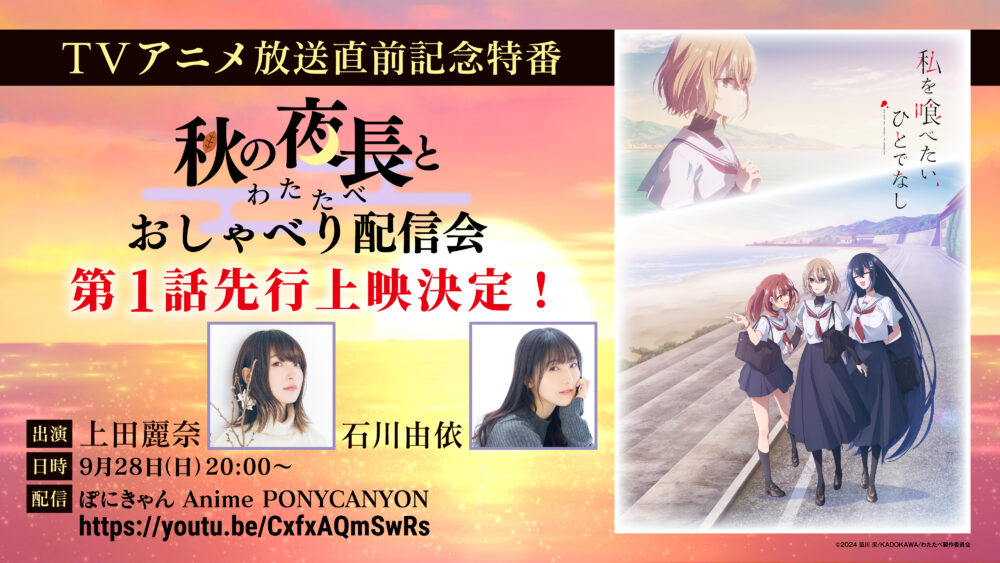 八百歳比名子役の上田麗奈と近江汐莉役の石川由依の2人が「私を喰べたい、ひとでなし」の魅力をたっぷり語る番組となっております。