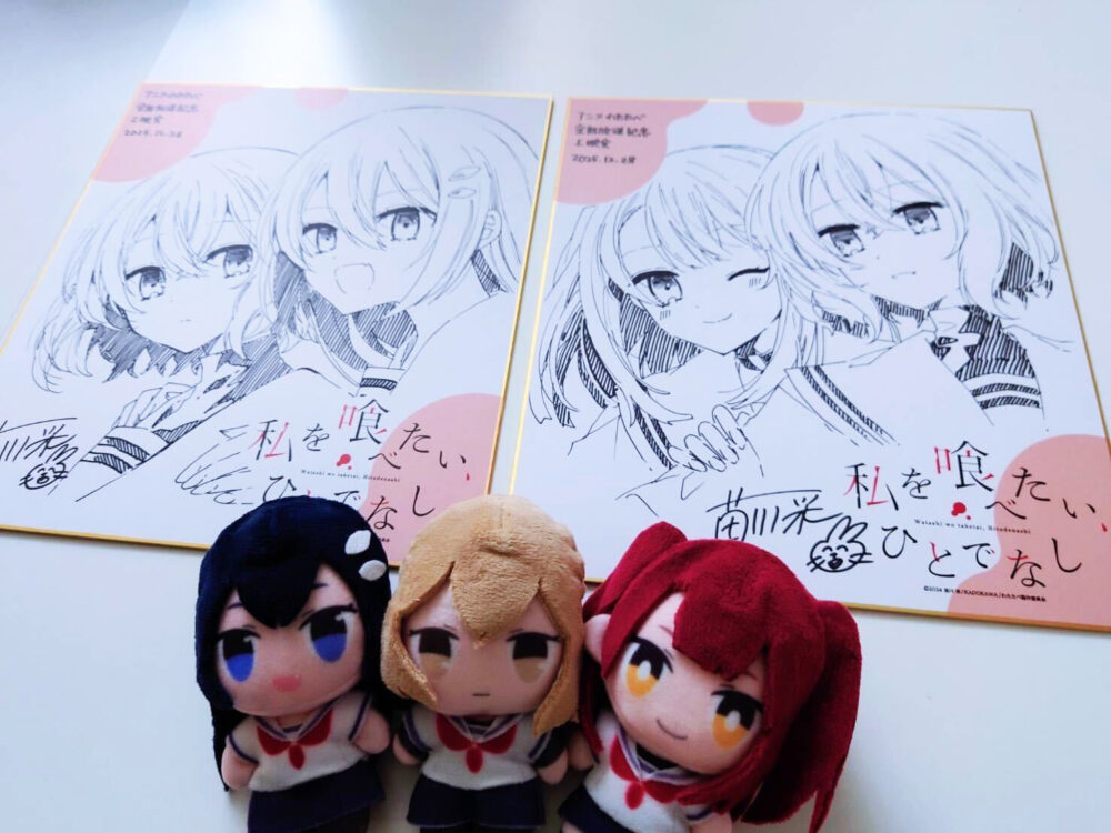 トークショーでは、豪華景品が当たる抽選会も開催。景品のひとつとなった「苗川采先生直筆イラスト色紙」第一部の色紙には比名子と美胡が、第二部の色紙には比名子と汐莉が描かれ、ファンの元へ贈られました。